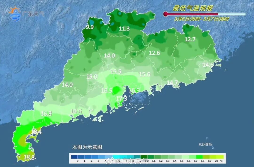 全省大部晴间多云。最低气温:粤北9~12℃,粤西和珠三角南部市县17~20℃,其余市县13~16℃。